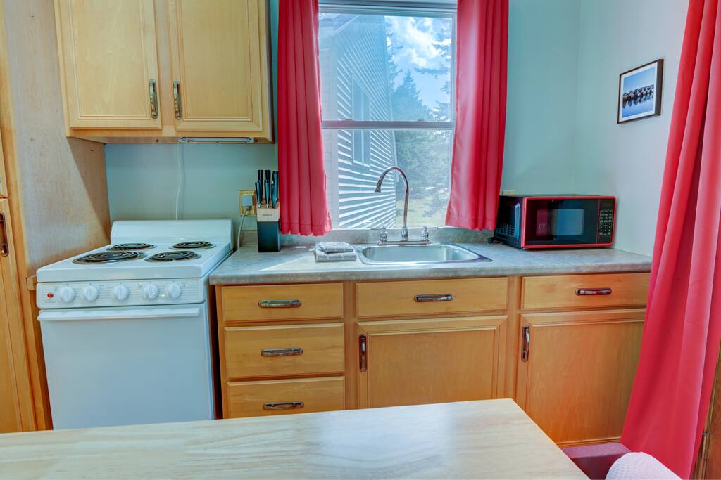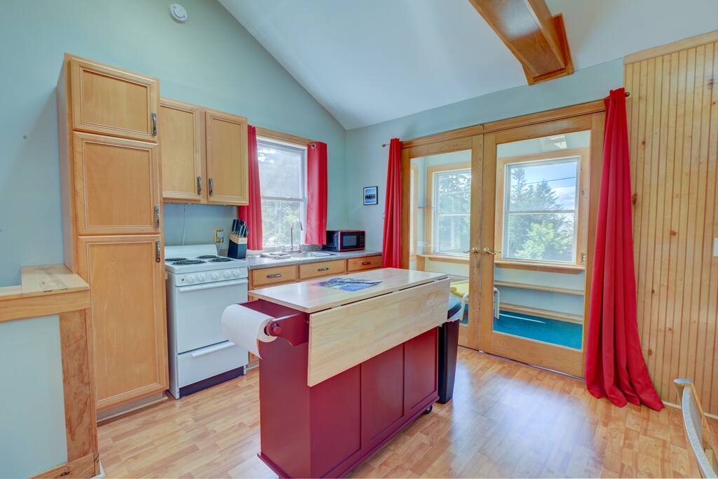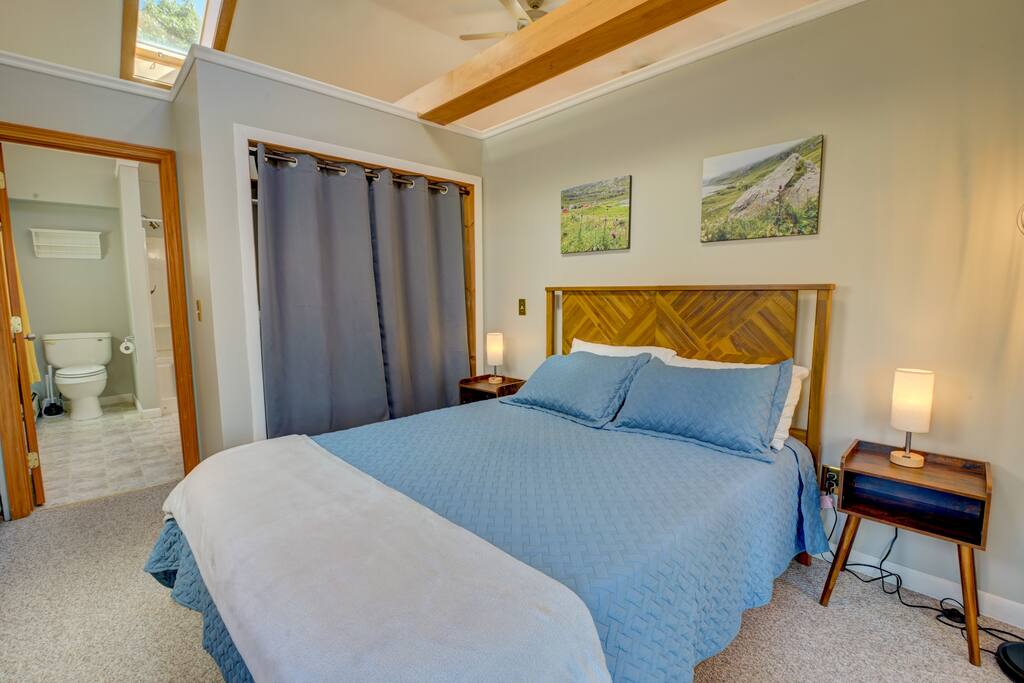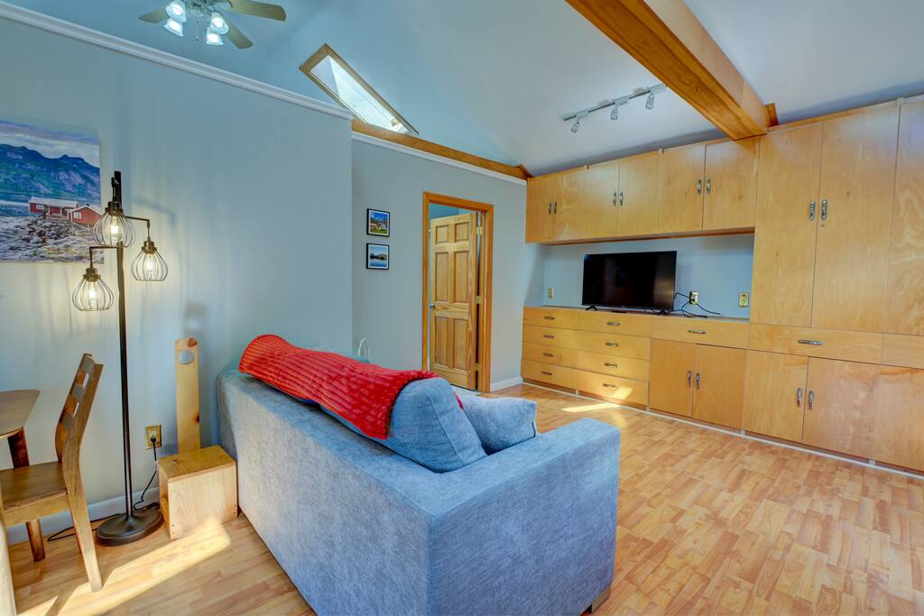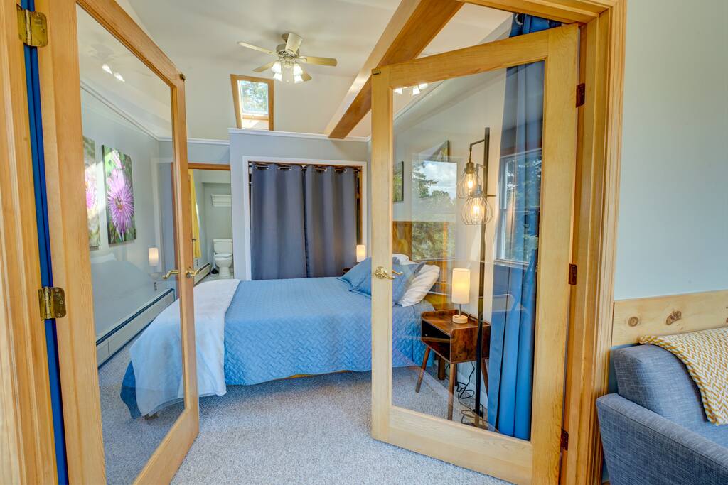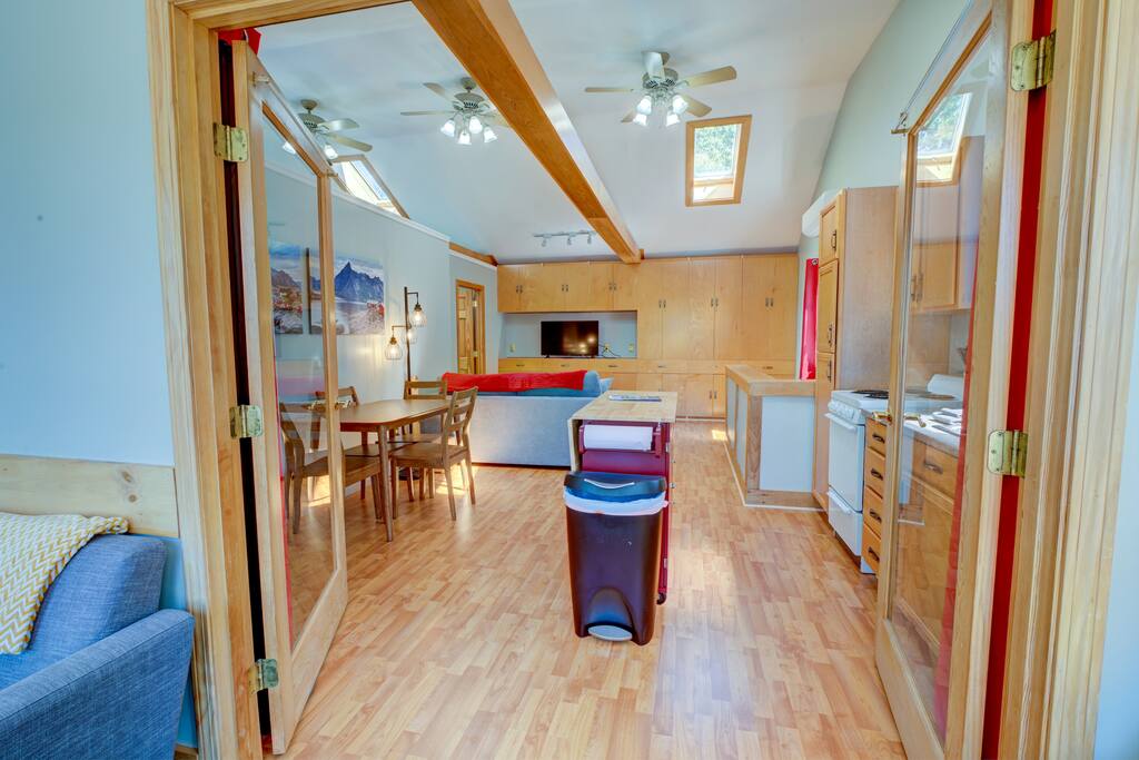 This unit has one bedroom with a queen sized bed. There is also a fold-out couch in the open-concept living room/kitchen area. Note that the entire space (living room, kitchen bedroom, and bath) are connected by the cathedral ceilings. If you are looking for two bedrooms with more privacy, check out the Hytta House (the attached property), or to book both units look for the Hytta Duplex.